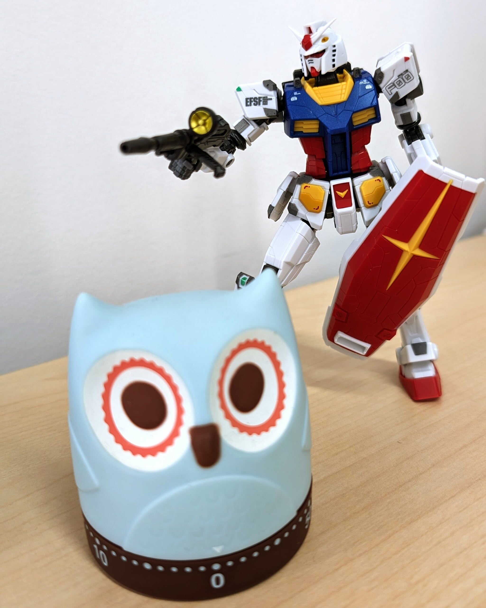 万众瞩目的高达是远方理想,猫头鹰则是眼前现实,那猫头鹰其实是个厨房计时器,帮助我运用“番茄工作法”的,即是全神贯注25分钟,然后休息5分钟。猫头鹰督促我努力,也许哪天我也能爬到高达的高度。